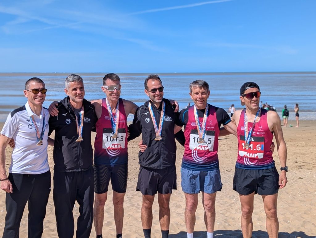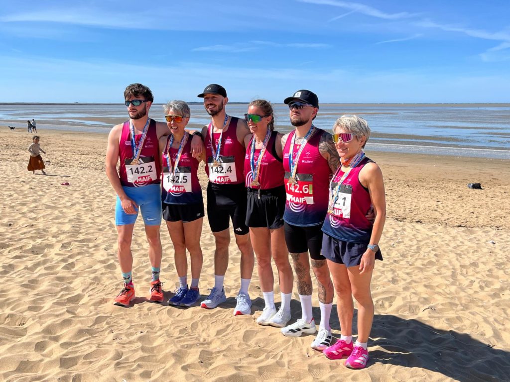 Ce week‑end, le club cournonnais était donc présent au championnat de France d’Ekiden à Châtelaillon‑Plage avec deux formations engagées : une équipe mixte, composée de trois garçons et trois filles (SUC Sandrine (M4F/68) / 5000m :21’36, DUARTE Theo (SEM/02) / 10000m :38’11, THOMAS Anais (M0F/91) / 5000m :23’09, DIDELOT Benjamin (SEM/95) / 10000m :38’02, BLANCHARD Cecile (M3F/72) / 5000m :20’33, PROVOST Adrien (SEM/93) / 7195m :28’13), et une équipe masculine Master identique à celle qui avait réalisés les minimas (BENARD Matthieu (M2M/78) / 5000:17’47, DUMAS Nicolas (M3M/75) / 10000:36’35, SUC Patrice (M4M/69) / 5000:20’06, VIDAL Nicolas (M2M/79) / 10000:35’03, PARROT Pascal (M5M/62) / 5000:20’38, BOUVIER Pierre (M1M/83) / 7195:25’43). Face à une concurrence nationale relevée et dans une ambiance de haut niveau, les athlètes ont su être à la hauteur de l’événement.
