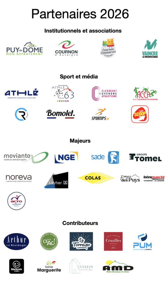 Le département du Puy de Dôme – La Ville de Cournon d’Auvergne – l’association des commerçants – l’association de lutte contre la Mucoviscidose – La Fédération Française d’Athlétisme – Le Comité Départemental d’Athlétisme – Le Clermont Auvergne Athlétisme – Running Conseil – Bomolet – Sportips – Radio Scoop – Movianto – NGE – Sade – Groupe Tomel – Noreva – Layher – Colas – Intermarché le Cendre – Acto Intérim médical – Arthur le Boulanger – CLAC – restaurant La Terrasse – Cruzilles – PUM – Blackrock Games – Eaux de Sainte Marguerite – Cournon Conseil & Courtage – AMD63