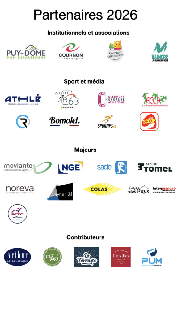 Le département du Puy de Dôme – La Ville de Cournon d’Auvergne – l’association des commerçants – l’association de lutte contre la Mucoviscidose – La Fédération Française d’Athlétisme – Le Comité Départemental d’Athlétisme – Le Clermont Auvergne Athlétisme – Running Conseil – Bomolet – Sportips – Radio Scoop – Movianto – NGE – Sade – Groupe Tomel – Noreva – Layher – Colas – Intermarché le Cendre – Acto Intérim médical – Arthur le Boulanger – CLAC – restaurant La Terrasse – Cruzilles …